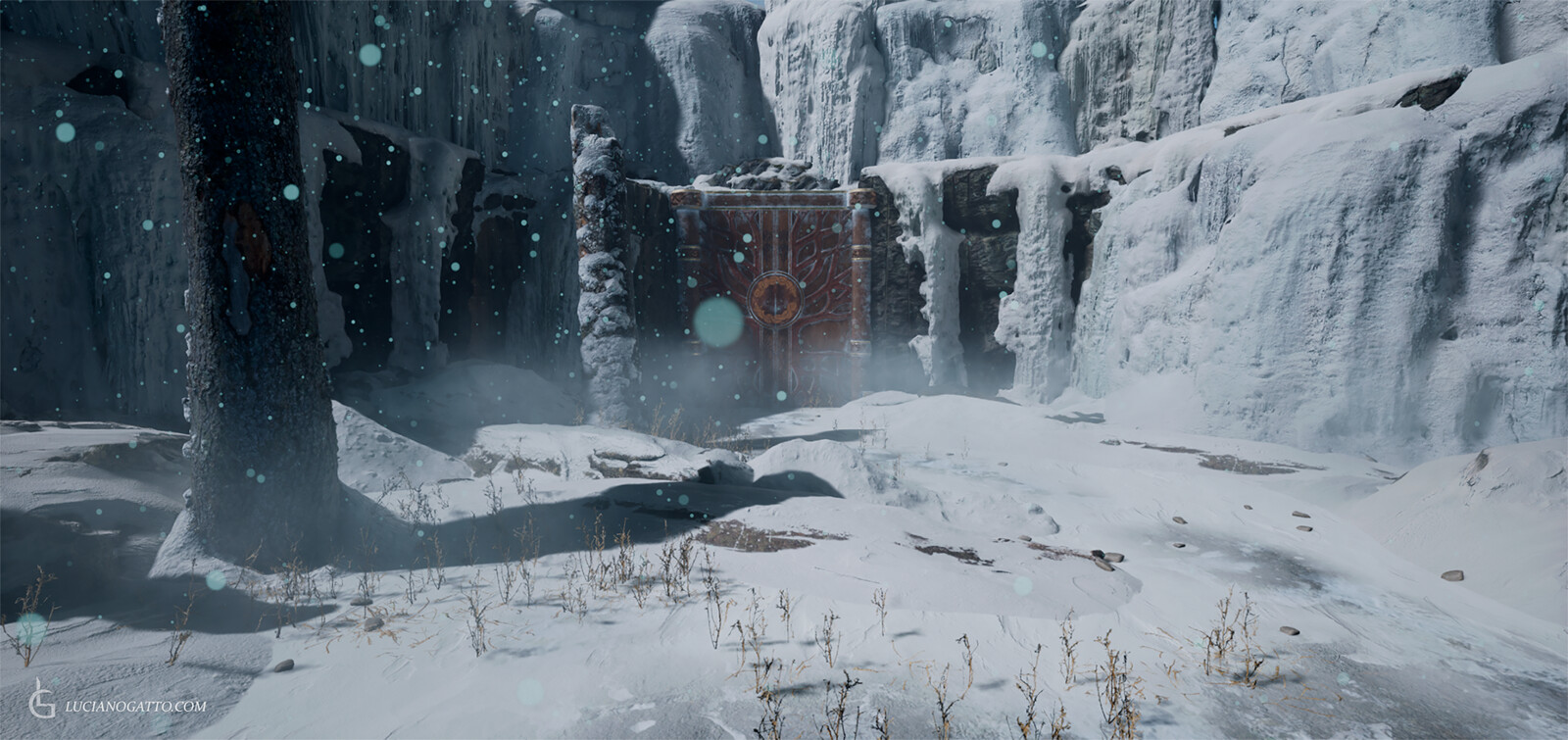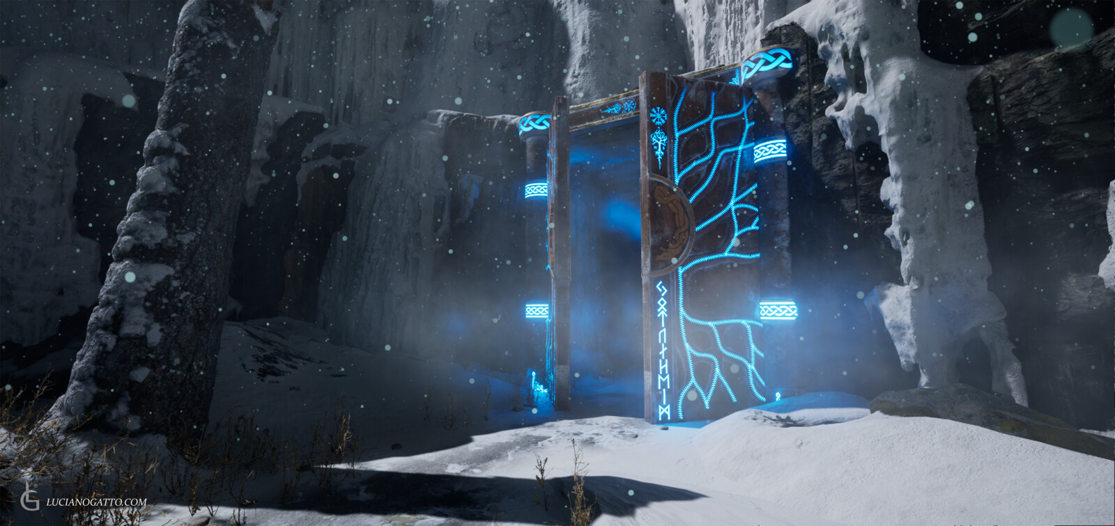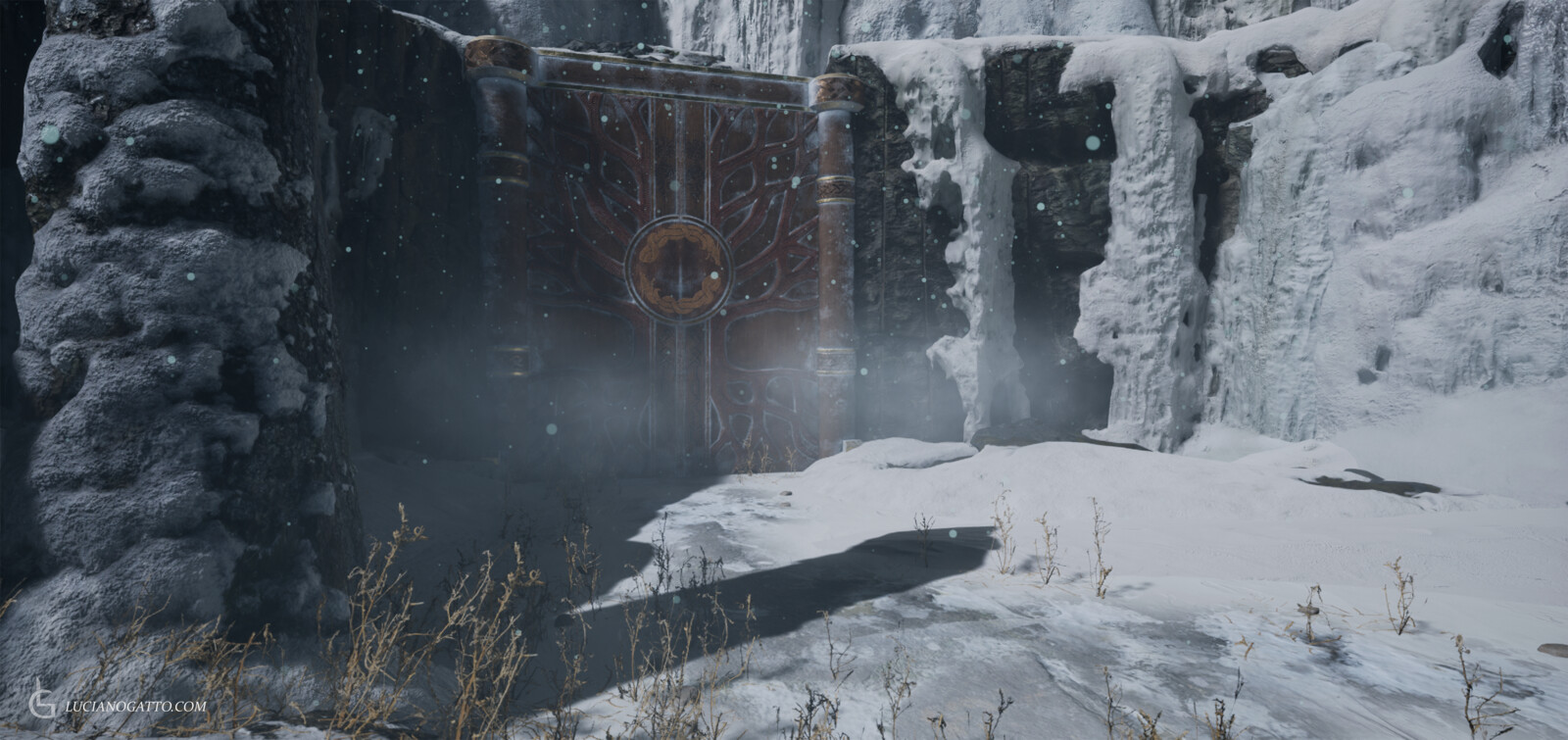 Hey everyone! This is my first final render inside Unreal Engine 5! Using the sequencer I created a cinematic inspired in one of my favorite modern games, God of War. This scene was created as an assignment for my Master's program and I was heavily inspired by the soundtrack of the game, hence why I used it on the final cinematic. Particles effects and snow assets are all Megascans and from other packs I own. The door, the pillars and the mechanism that opens the door are all modeled and textured by me, including the emissive "power up" effect. All the composition and lighting was created by me, including the sequence of events and cinematic.