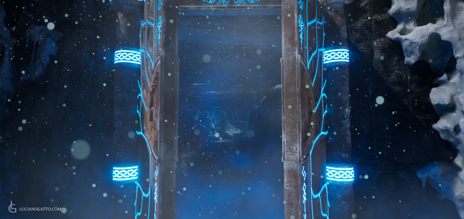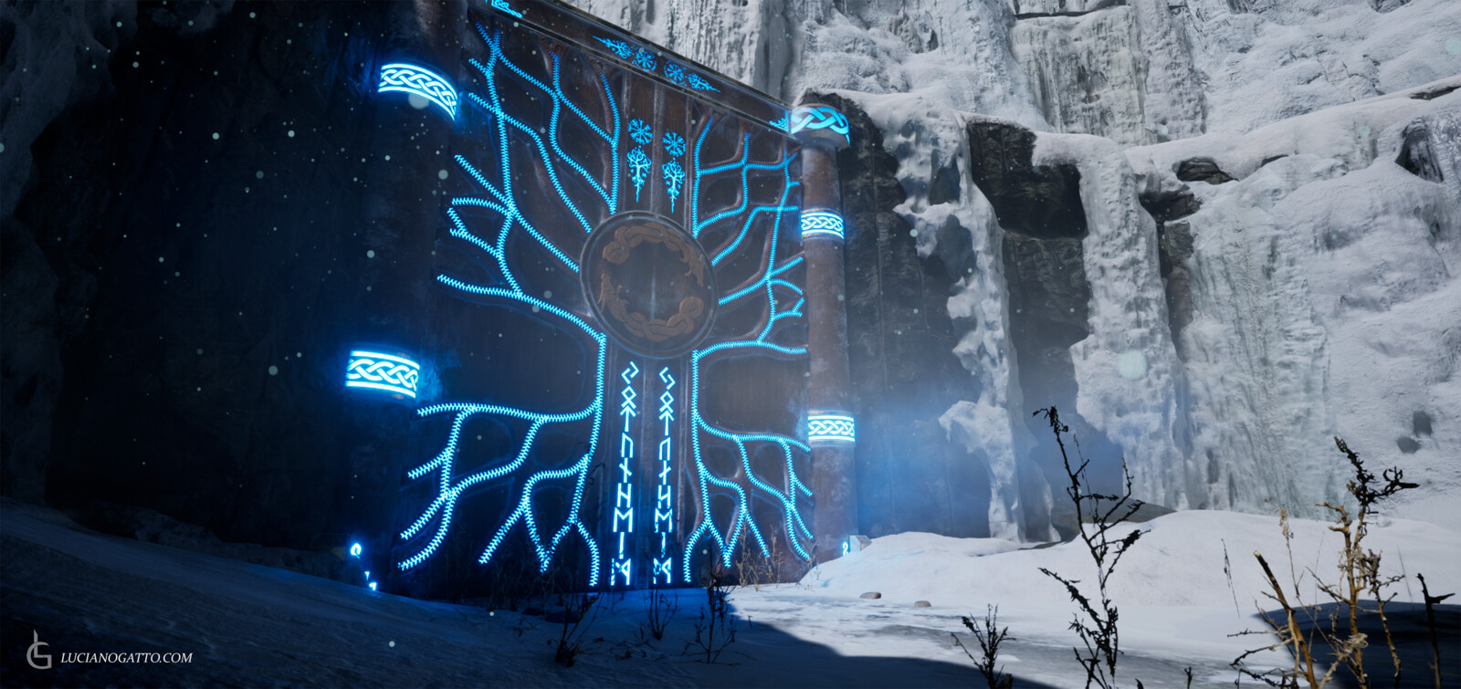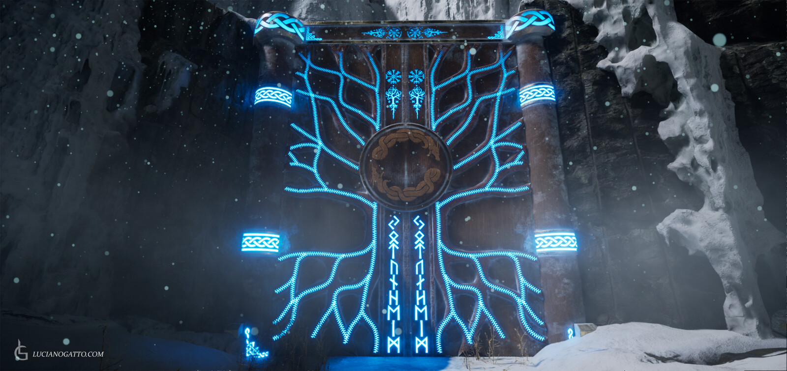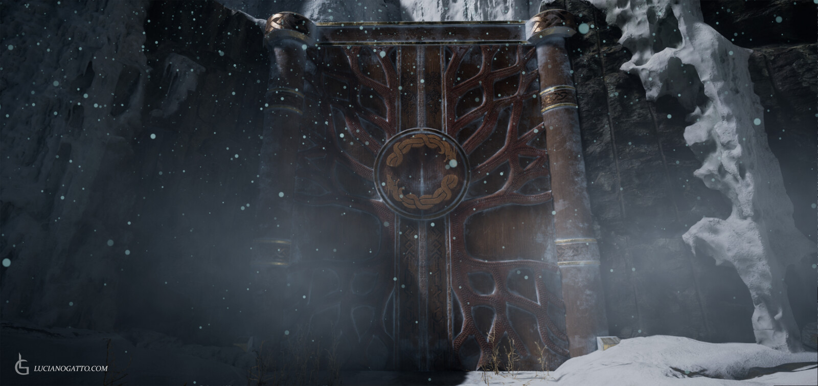 Hey everyone! This is my first final render inside Unreal Engine 5! Using the sequencer I created a cinematic inspired in one of my favorite modern games, God of War. This scene was created as an assignment for my Master's program and I was heavily inspired by the soundtrack of the game, hence why I used it on the final cinematic. Particles effects and snow assets are all Megascans and from other packs I own. The door, the pillars and the mechanism that opens the door are all modeled and textured by me, including the emissive "power up" effect. All the composition and lighting was created by me, including the sequence of events and cinematic.